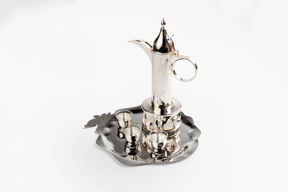 Silver Dallah Coffee Pot with Heater in palm tree and camel motifs
