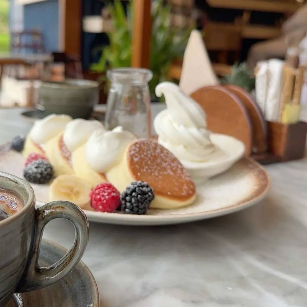 استمتع بوجبة بان كيك دافئة وشهية، تتميز بقوامها الذهبي والطري. يُقدم هذا الطبق مزينًا بتشكيلة سخية من الفواكه الطازجة المقطعة، ويُسكب فوقه شراب القيقب أو العسل الغني، ليمنحك توازنًا مثاليًا بين الحلاوة الطبيعية للفاكهة والمذاق الغني للشراب، وجبة مثالية لبداية يوم مليء بالطاقة.