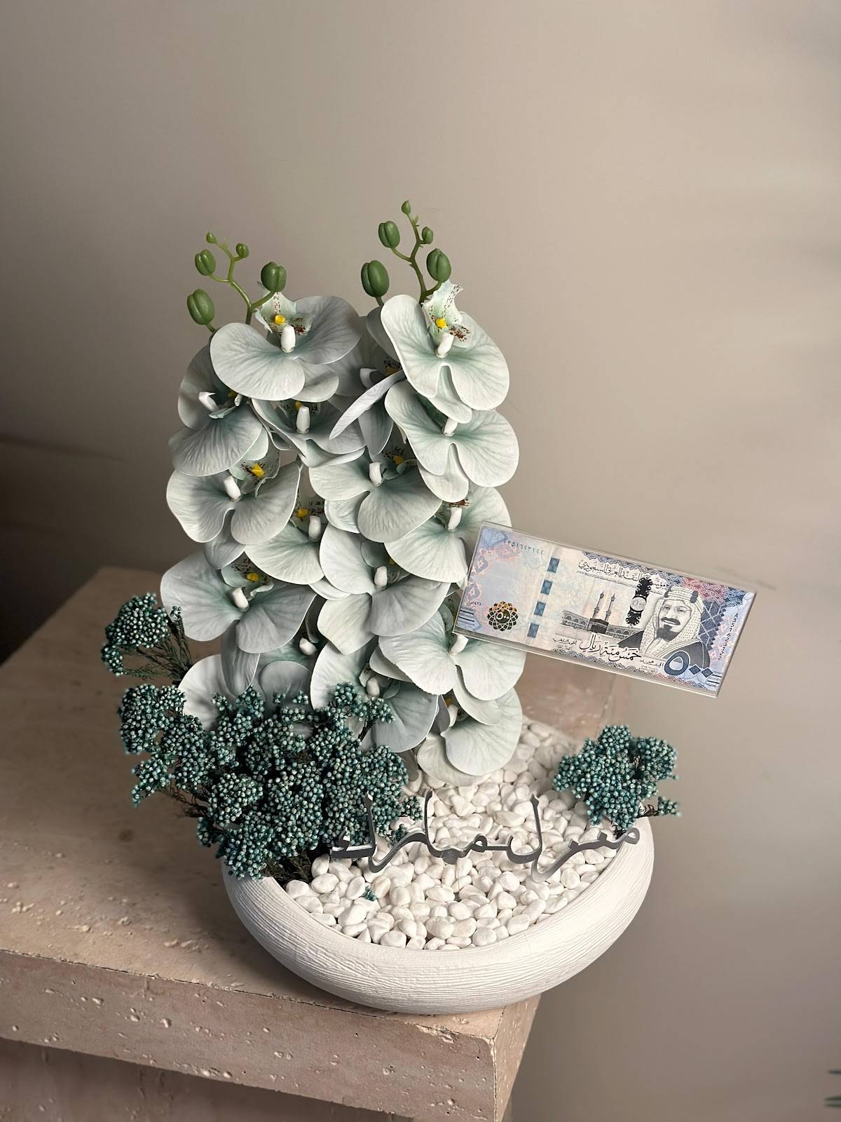 أضف لمسة من الفخامة الدائمة إلى ديكورك مع تنسيق الأوركيد الصناعي هذا، المصمم ليحاكي الجمال الطبيعي للأوركيد بأدق التفاصيل. يتميز هذا التنسيق بأزهار أوركيد اصطناعية عالية الجودة، تبدو وكأنها حقيقية تمامًا، ولا تتطلب أي عناية، مما يضمن جمالها الدائم على مدار العام. سواء كنت تبحث عن قطعة فنية لمكتبك، أو لإضفاء رونق على غرفة المعيشة، فإن هذا التنسيق يقدم حلًا أنيقًا وعمليًا. ولجعل هديتك أكثر تميزًا، يأتي هذا التنسيق مرفقًا ببطاقة هدية بقيمة ٥٠ ريال سعودي، لتكون لفتة كريمة تضاف إلى جمال الأوركيد.