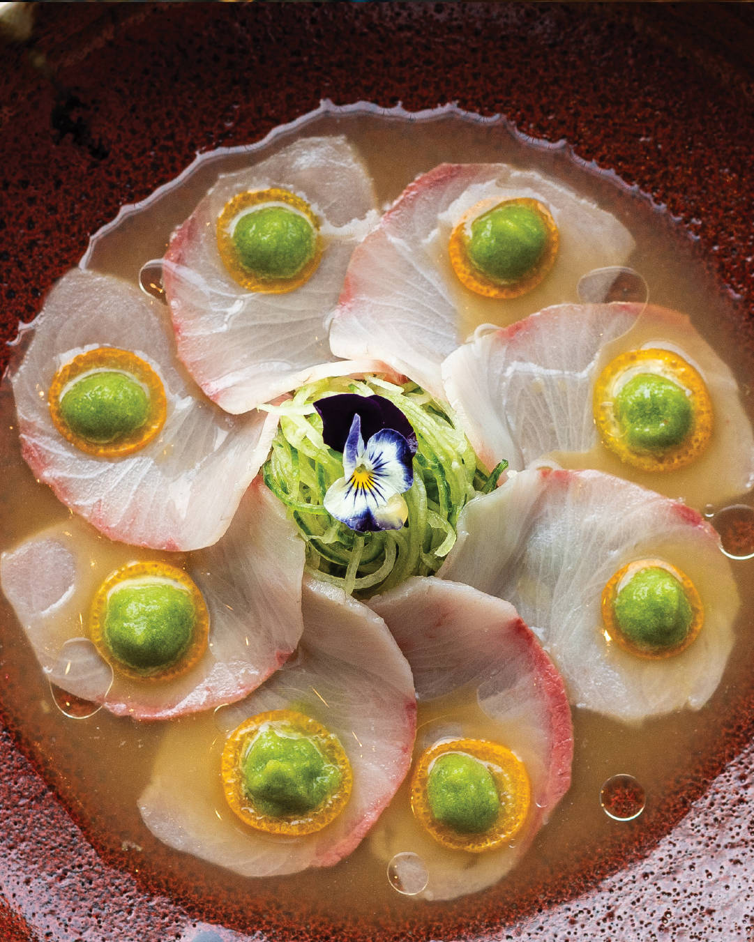 هاماتشي تاتاكي شرائح رفيعة من اليلو تيل الياباني تقدم مع صوص اليوزو بونزو الحامض، الشيشيتو، الكمكوات المخلل والترفل